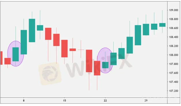 3. Ang mga candlestick na may maliliit na katawan na nagpapakita ng itaas at ibabang mga anino ay nagpahiwatig ng posibleng pagbabago ng trend (o trend pause).