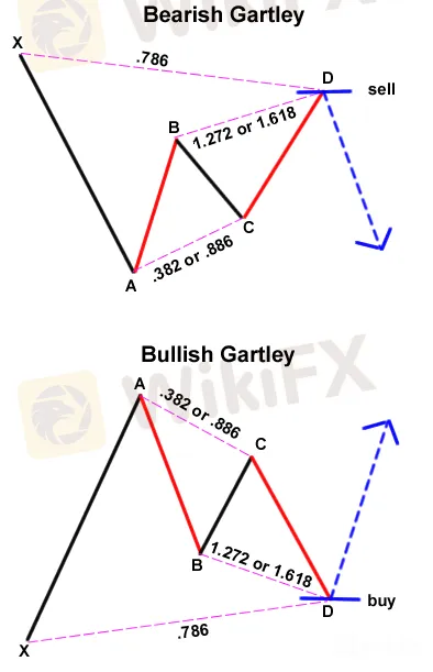 Sa anumang kaso, ang pattern ay naglalaman ng isang bullish o bearish na pattern ng ABCD, ngunit nauunahan ng isang punto (X) na lampas sa punto D.