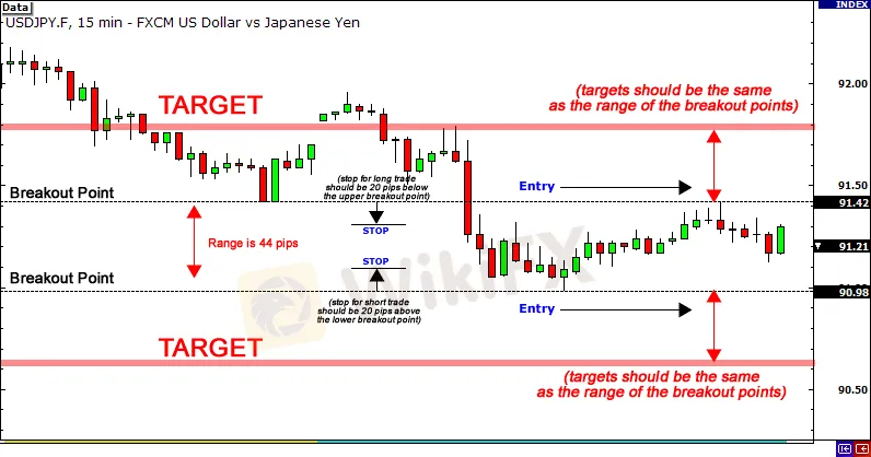 Dito mo gustong itakda ang iyong mga order. Ang iyong mga paghinto ay dapat ilagay sa humigit-kumulang 20 pips sa ibaba at sa itaas ng mga breakout point, at ang iyong mga unang target ay dapat na halos pareho sa hanay ng mga antas ng breakout.