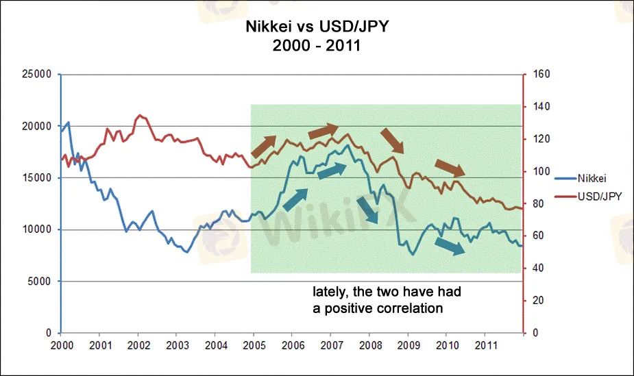 Bago ang pandaigdigang pag-urong ng ekonomiya na nagsimula noong 2007, nang ang karamihan sa mga ekonomiya ay dumanas ng magkakasunod na quarter ng negatibong paglago ng GDP, ang Nikkei at ang USD/JPY ay inversely correlated.