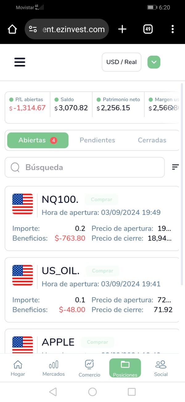 Tengan buen día, me dirijo a usted para informarle que la plataforma de inversión ezinvest, me ha estado induciendo a realizar una serie de operaciones que según " briggitte casas " asesora comercial de dicha plaforma, no serían riesgosas y si muy beneficiosas. Las operaciones se realizaron según sus espesificaciones. Estas operaciones han puesto la cuenta en iliquides financiera, en varias ocasiones haciendo que tenga que respaldar la cuenta, para protejer mi inversión, esto lo a hecho en varias ocasiones para liquidar la cuenta, por lo tanto acudo a ustedes para que me ayuden a recuperar lo quemás puedan de mi inversión de antemano muchas gracias por todo. Dejo constancia gráfica de lo que digo