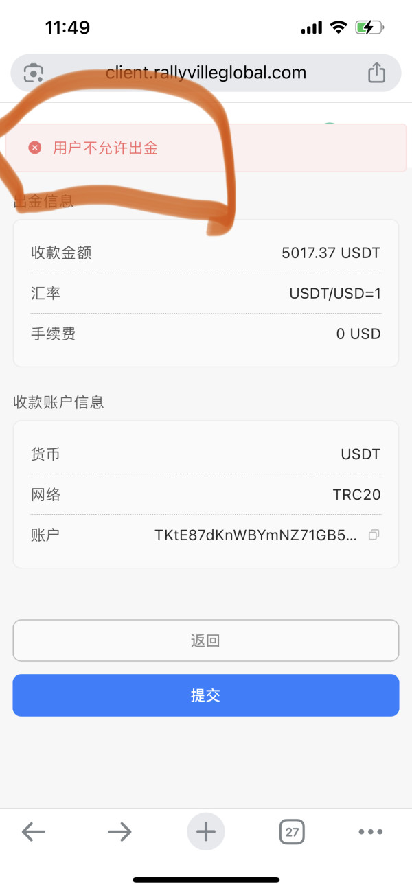 已经一个多星期了,发了邮件给客服也完全没有回复。正常交易盈利了被指违规交易。锁仓高频交易这种的。而且完全没有这类交易情况。就随便找个理由说不给出金.RallyVille(RV)这个平台注意一下。尽量撤离。不然赚钱多了也会不给出金的。