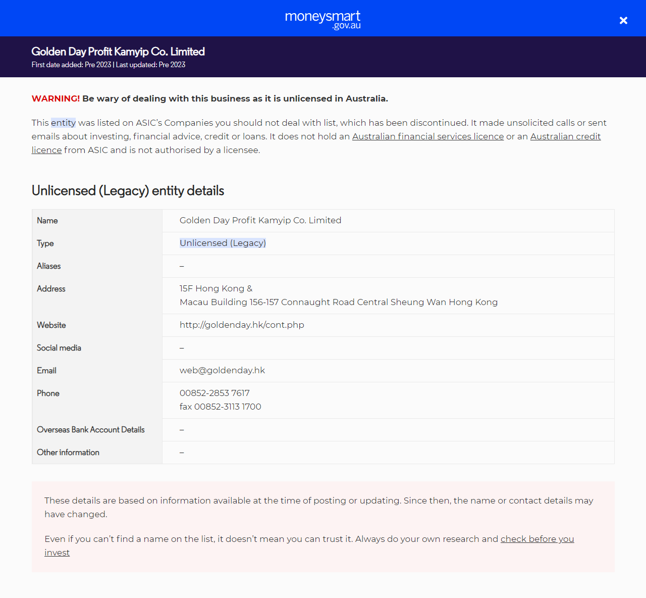 liste d'alerte aux investisseursGolden Day Profit Kamyip Co. Limited.