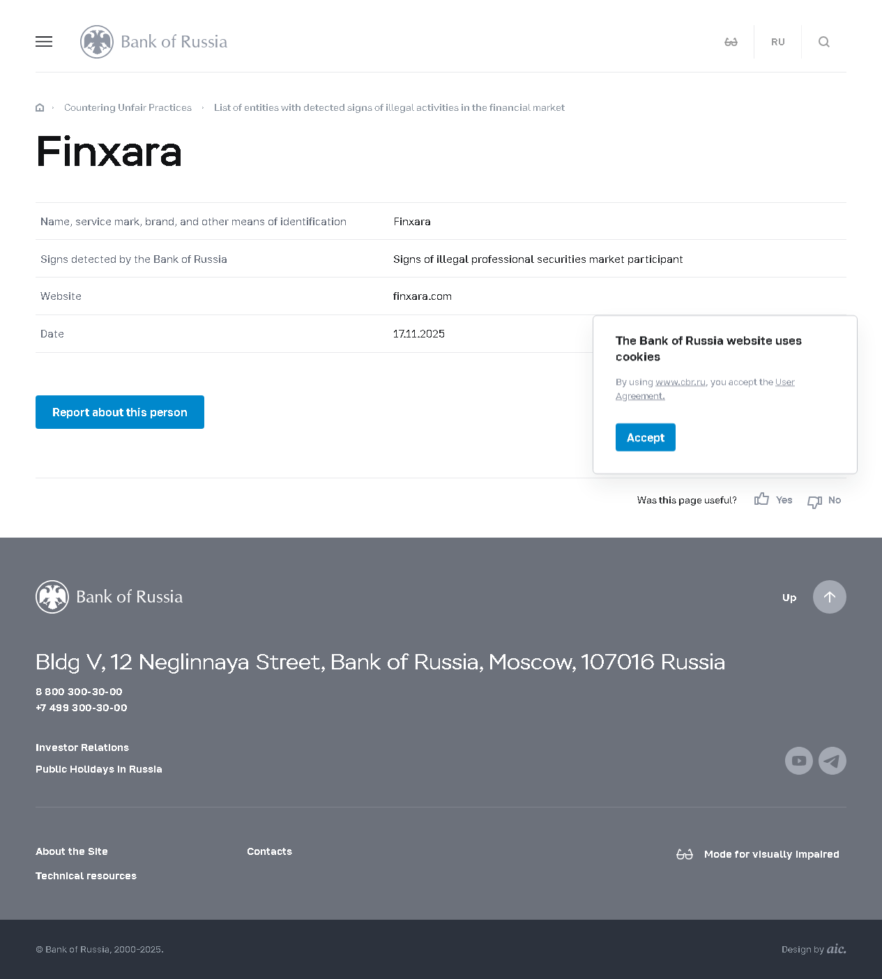 Liste des entités présentant des signes d'activités illégales sur le marché financier Finxara.