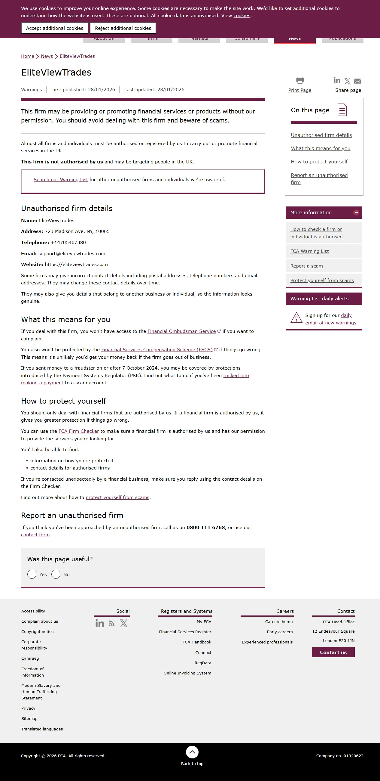 Liste d'avertissement de la FCA concernant les sociétés non autorisées EliteViewTrades.
