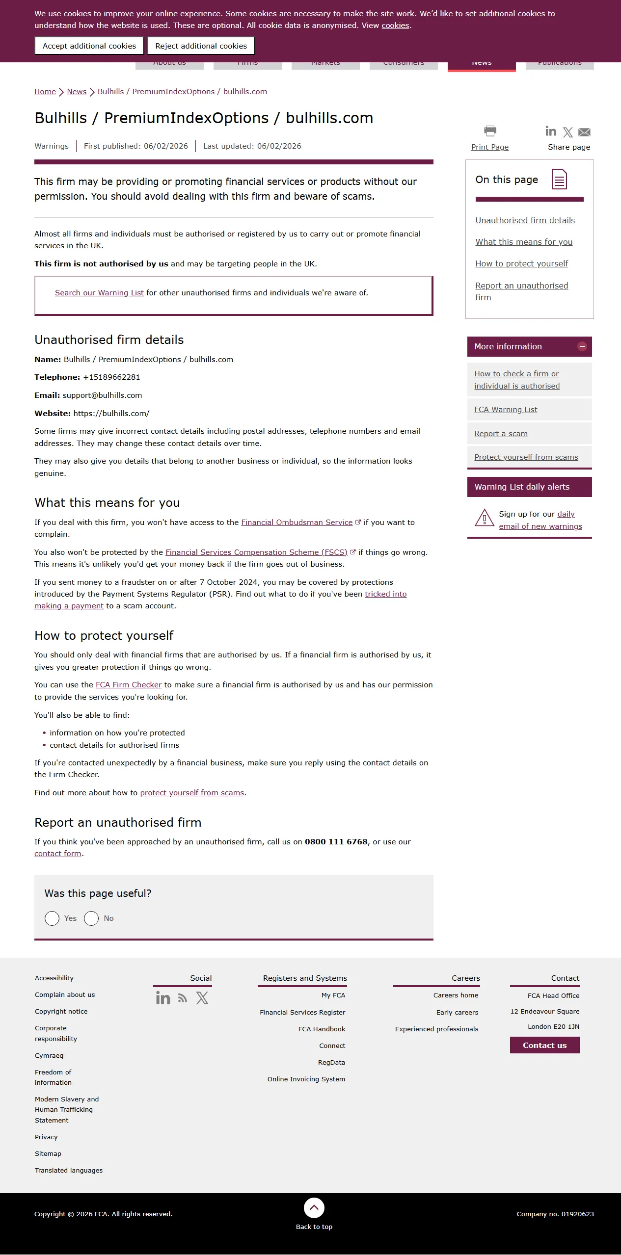 Liste d'avertissement de la FCA concernant les sociétés non autorisées Bulhills / PremiumIndexOptions / bulhills.com.