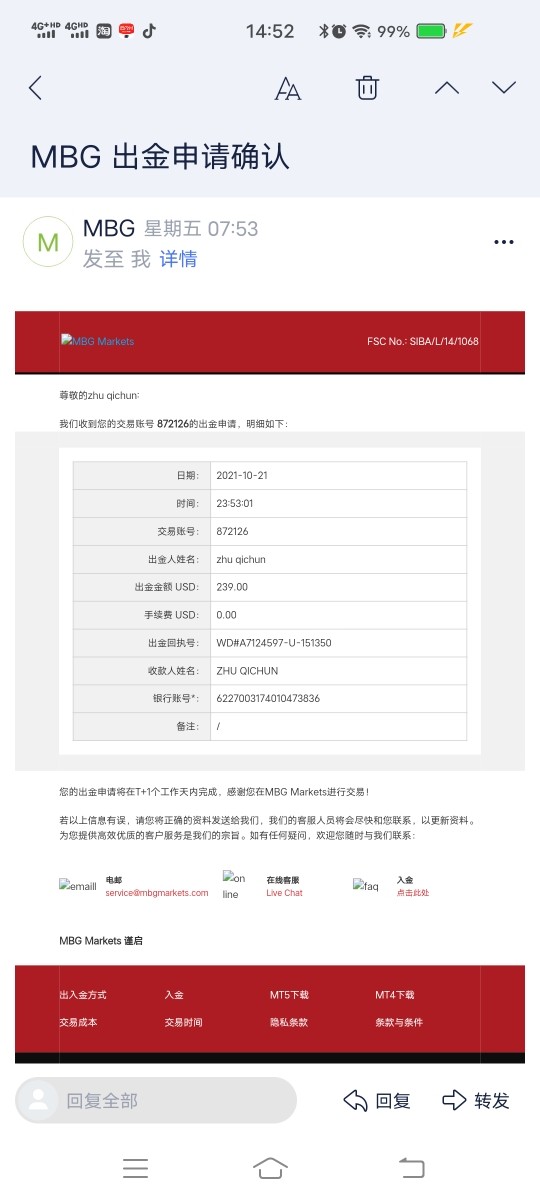 MBG一直出不了金,问客服,说平台要关闭,并说在关闭前会将客户平移到大通公司总部,结果按照他们的步骤去操作,每一个流程都说在排队等候处理,现在已过去十多天了,都还没开始平移过去,完全就是跑路前的缓兵之际啊,而入金正常,这是想在跑路前再黑一把吧。微信投诉,国家反诈中心报警。