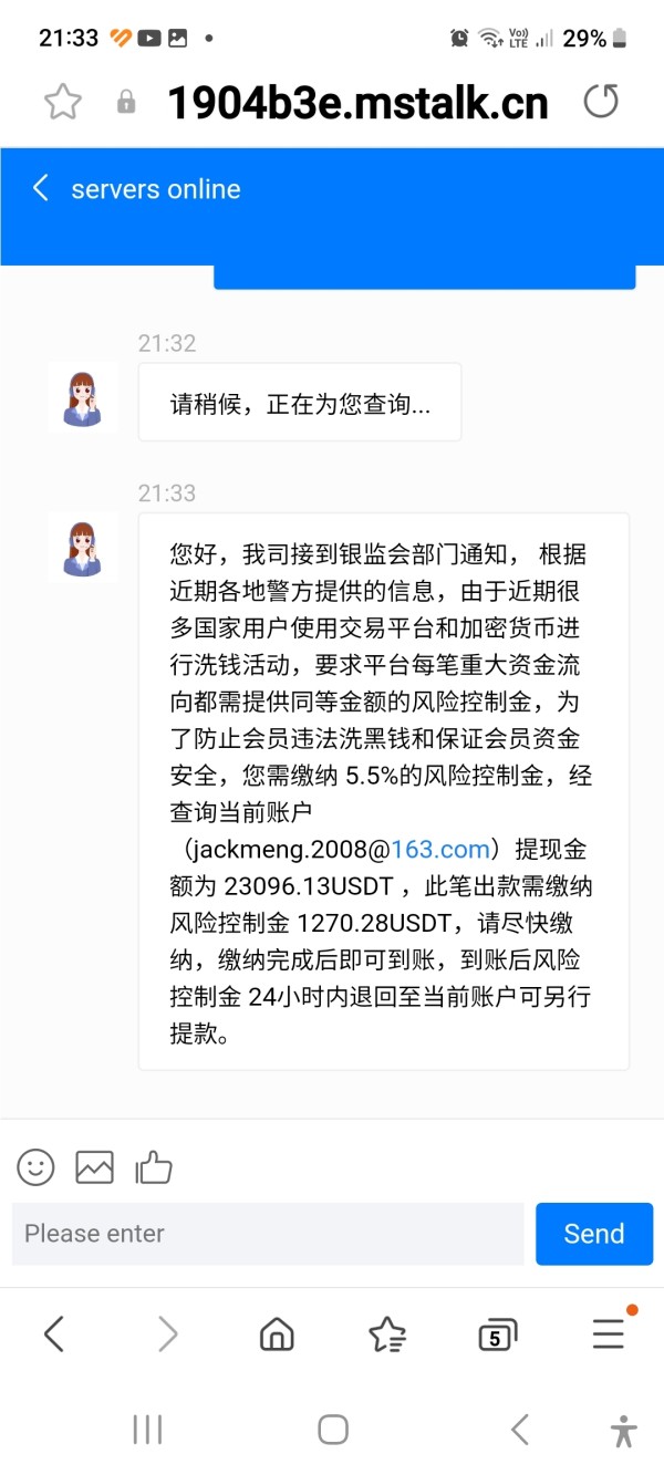 在一个网友的介绍下进了这个网站买币。先是赚了260usdt 让你提币转账后。再继续投入了差不多15000澳元。到一次转币4000usdt 的时候就以不是你的地址为由扣着不放并冻结资产。等我交纳了所谓的验资后就要再进多了百分之八十的流水量。等我要提款时就要交2210usdt的抽水。的我交了后,又以滞纳金为由要交每天百分之五的钱。今天交完了又以风险控制金为由再1270usdt的钱。这个是钓鱼平台请慎重。