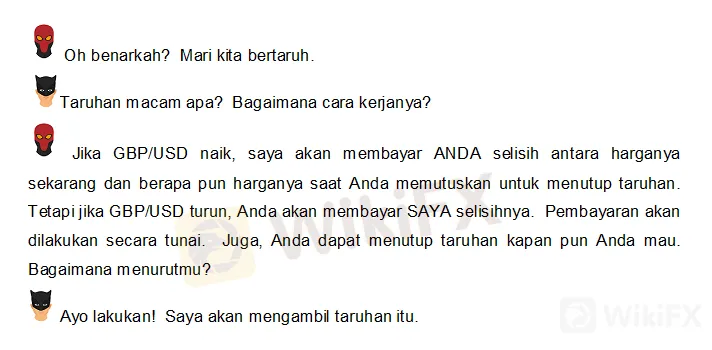 • Tergantung ke arah mana harga bergerak, satu pihak membayar yang lain selisih antara waktu taruhan dibuat hingga saat taruhan ditutup.