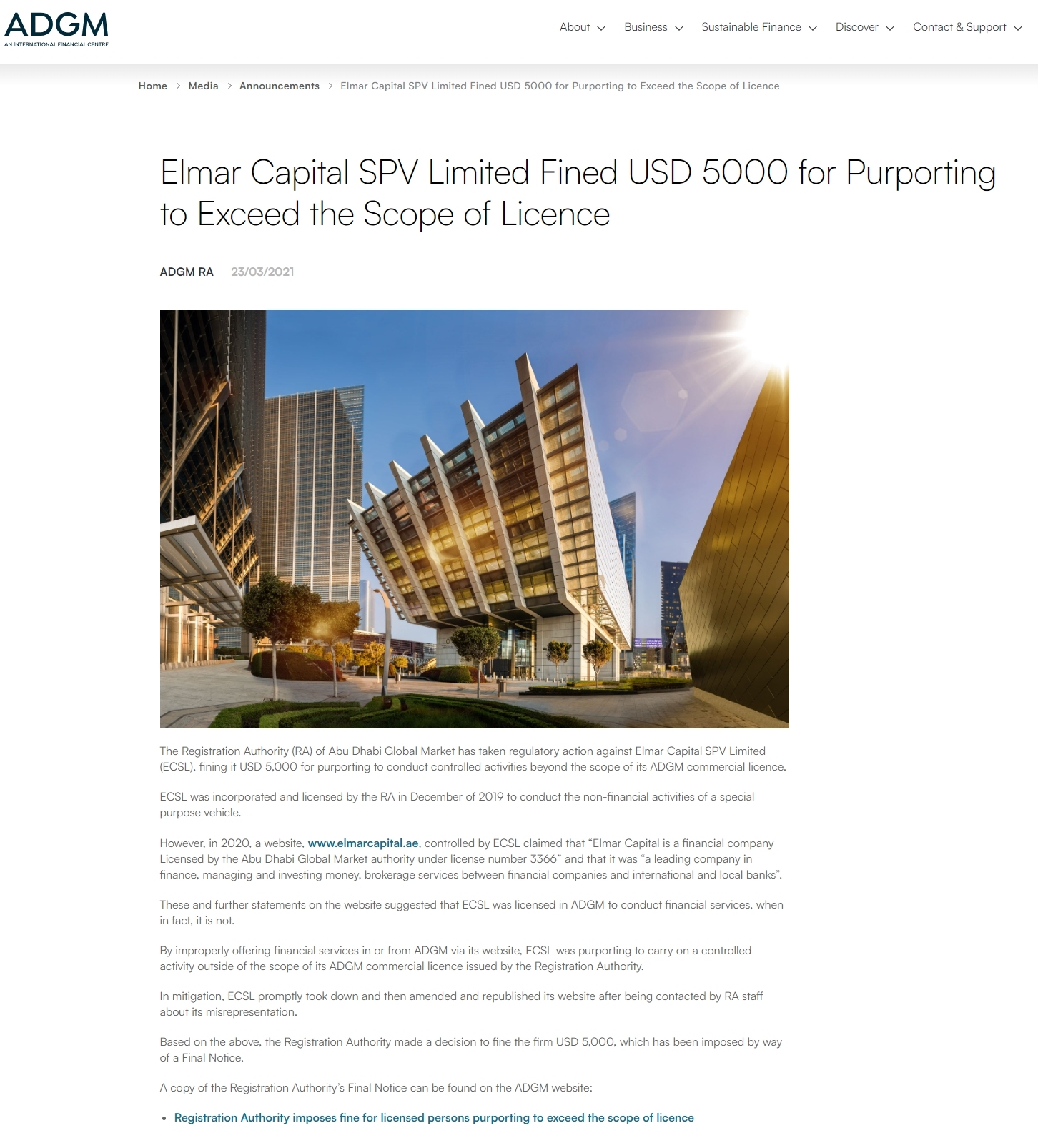 - Alasan hukuman otoritas registrasi (ra) pasar global abu dhabi telah mengambil tindakan regulasi terhadapnya Elmar Capital spv limited (ecsl), mendendanya sebesar usd 5.000 karena mengaku melakukan aktivitas terkendali di luar cakupan izin komersial adgmnya.