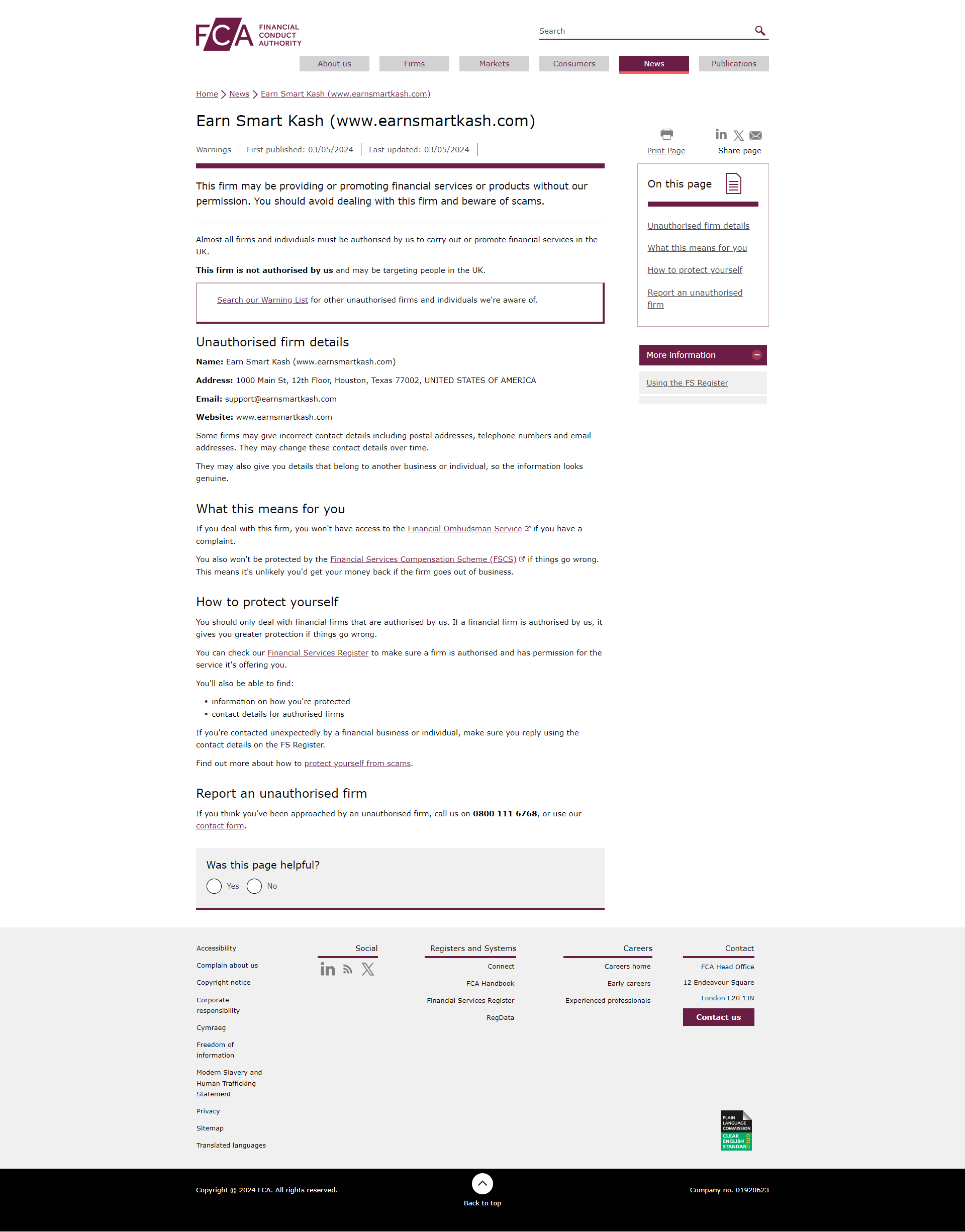 Daftar Peringatan FCA mengenai perusahaan yang tidak berwenang Earn Smart Kash (www.earnsmartkash.com).