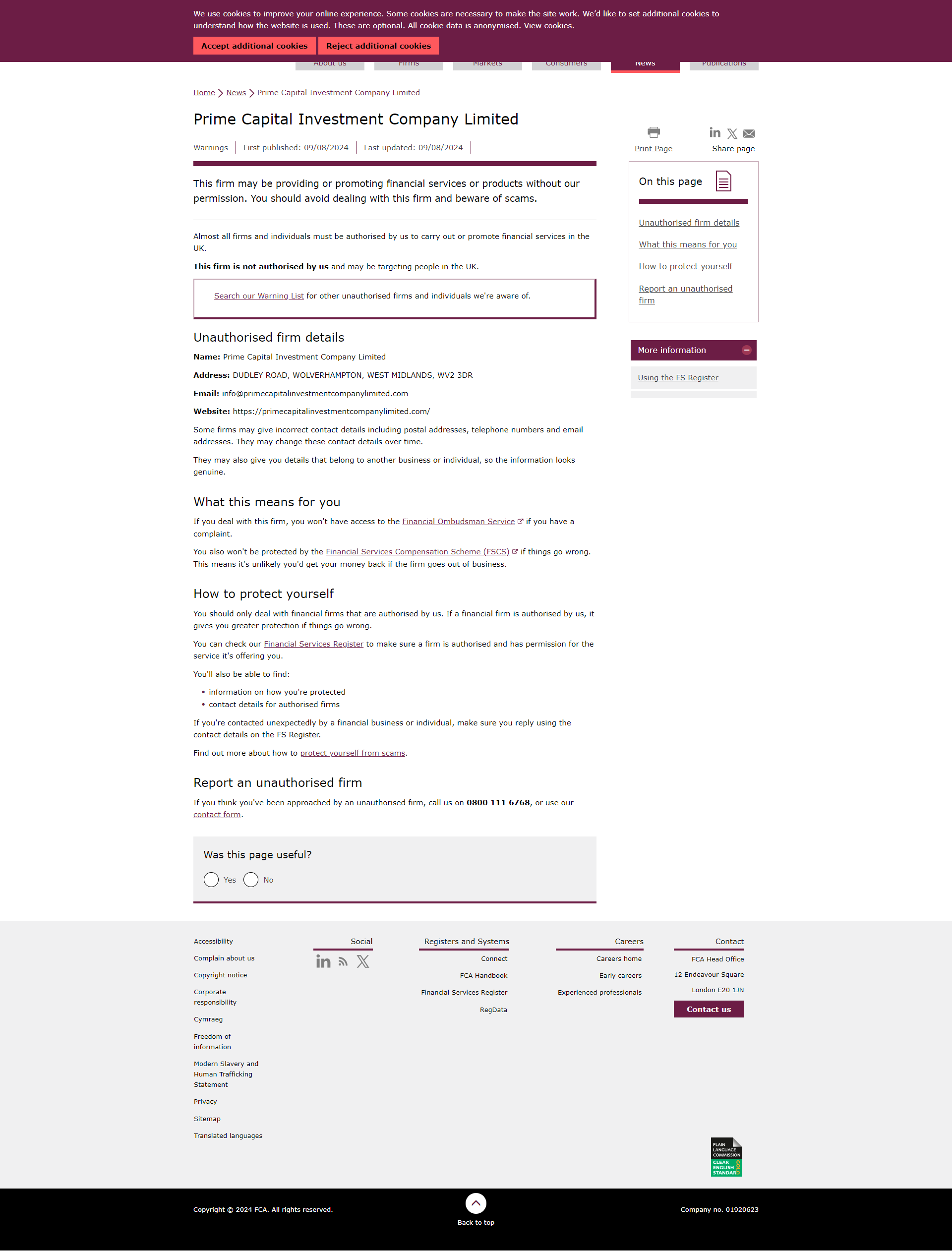Daftar Peringatan FCA mengenai perusahaan tidak berwenang Prime Capital Investment Company Limited.