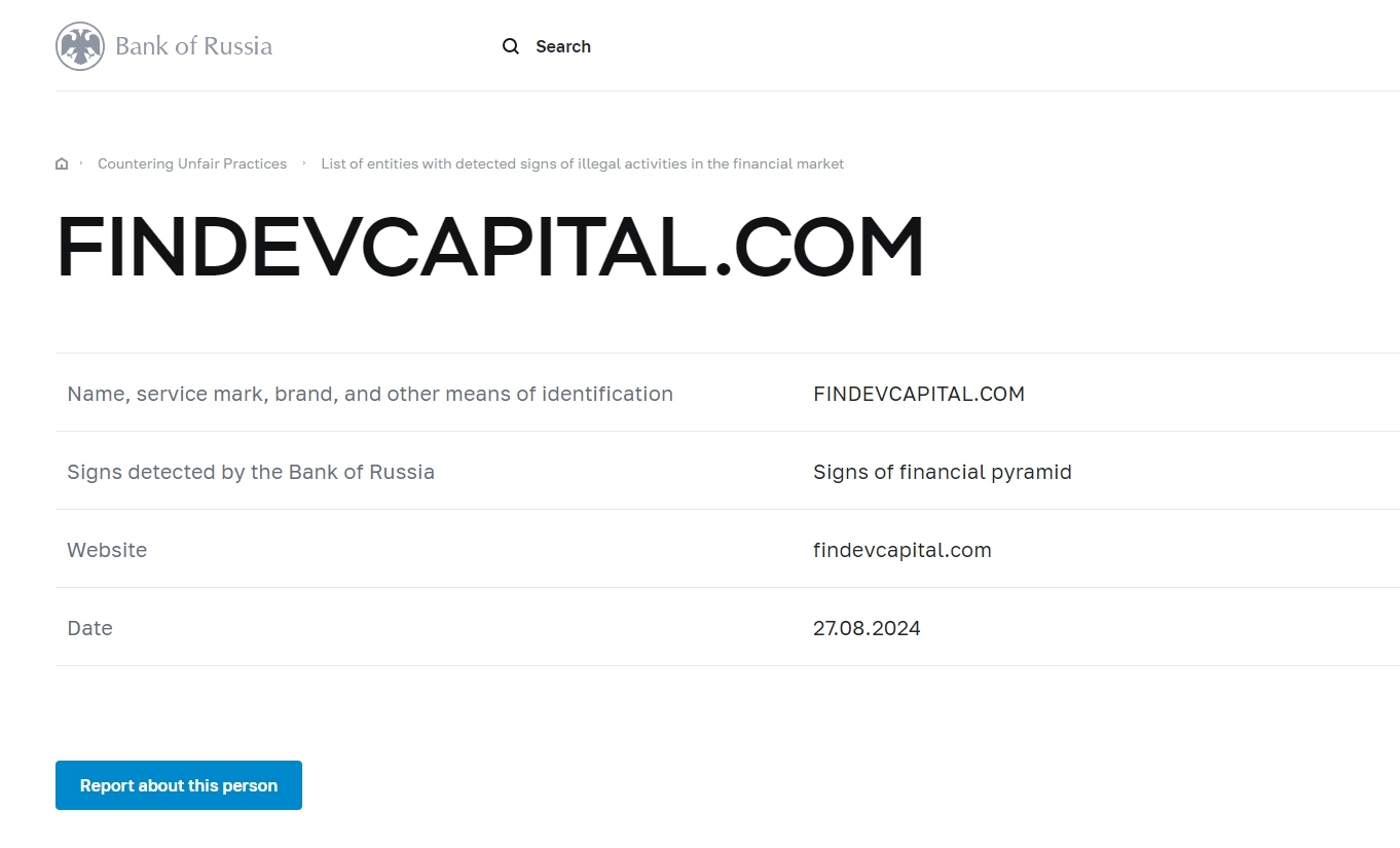 Daftar entitas dengan tanda terdeteksi kegiatan ilegal di pasar finansial FINDEVCAPITAL.COM.