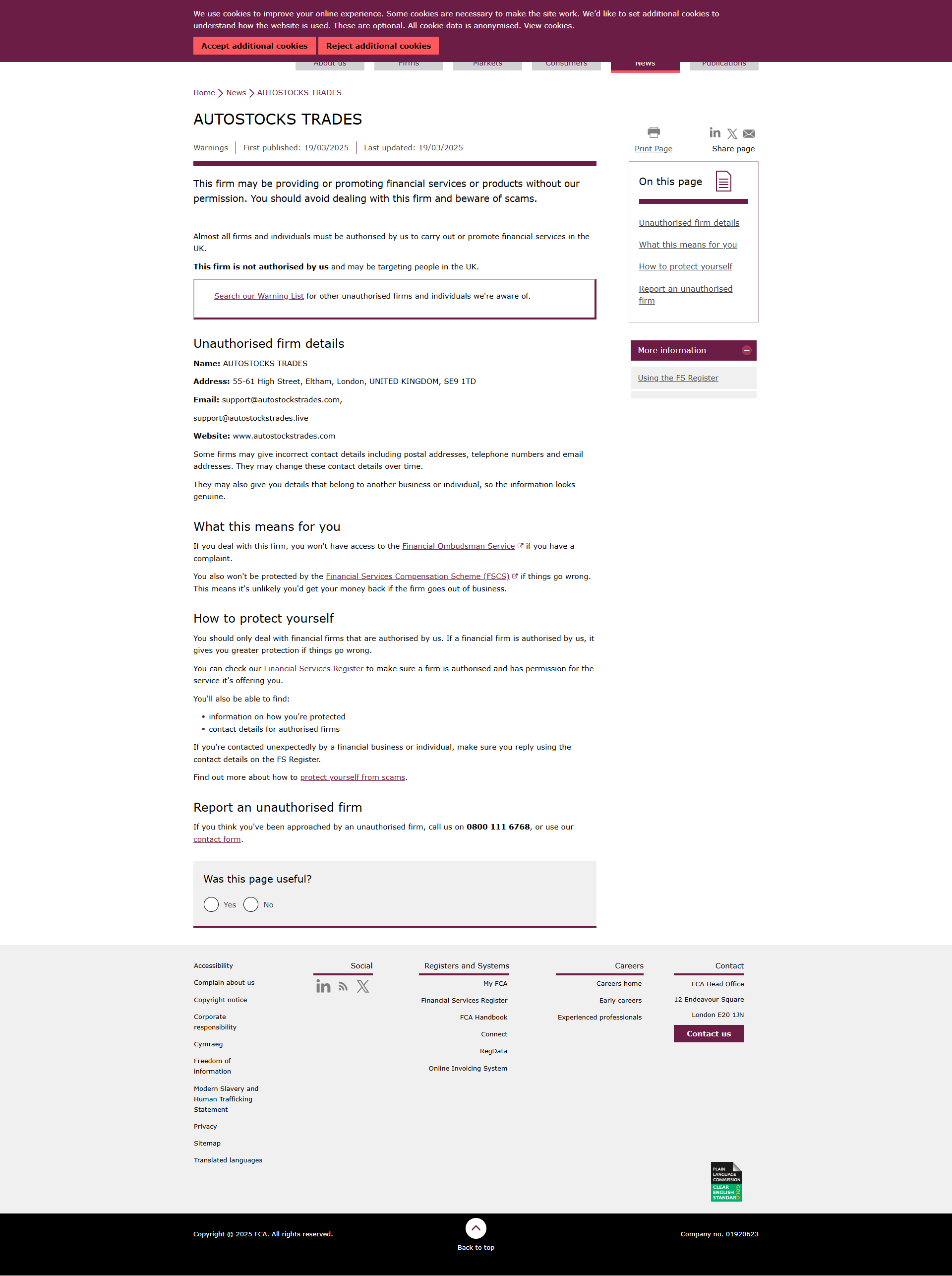 Daftar Peringatan FCA mengenai perusahaan yang tidak berwenang AUTOSTOCKS TRADES.