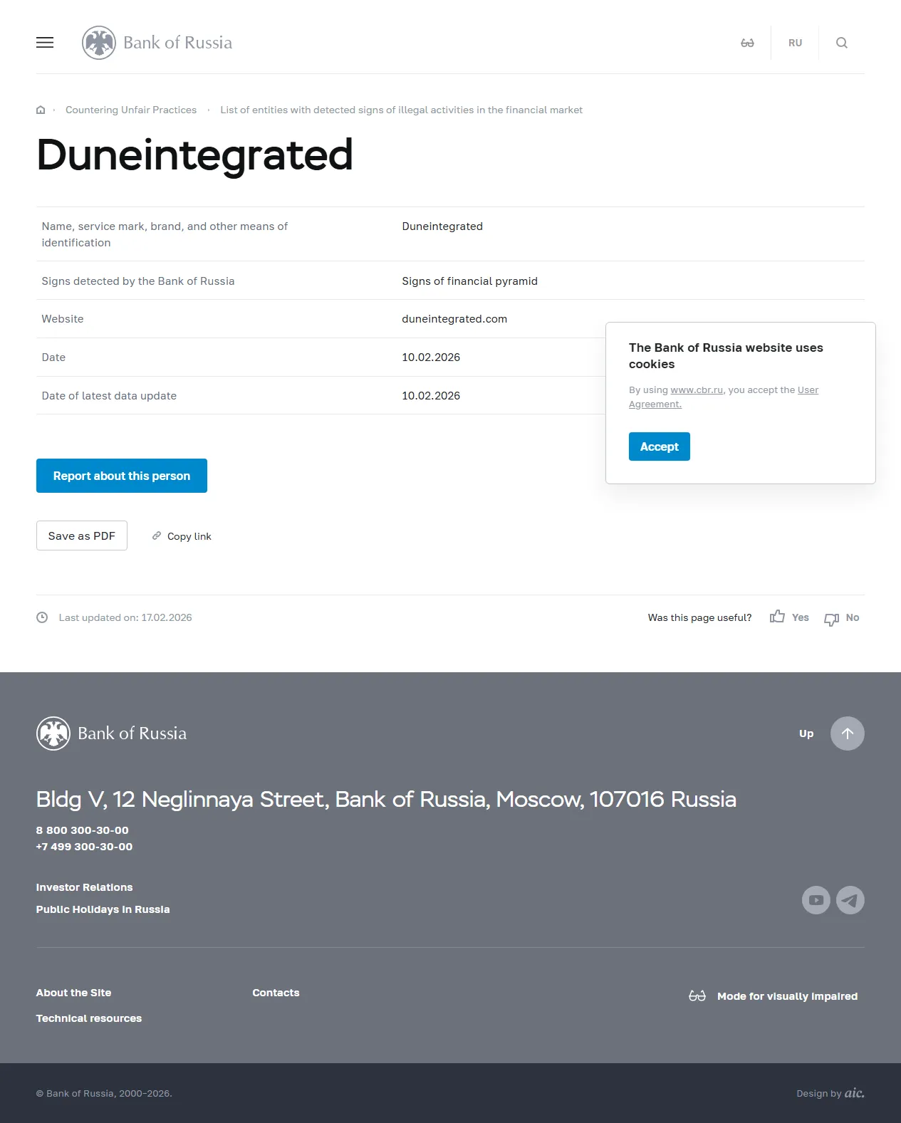 Nama, tanda layanan, merek, dan cara identifikasi lainnya Duneintegrated Tanda-tanda yang terdeteksi oleh Bank Rusia Tanda-tanda piramida keuangan Situs web duneintegrated.com Tanggal 10.02.2026 Tanggal pembaruan data terakhir 10.02.2026.