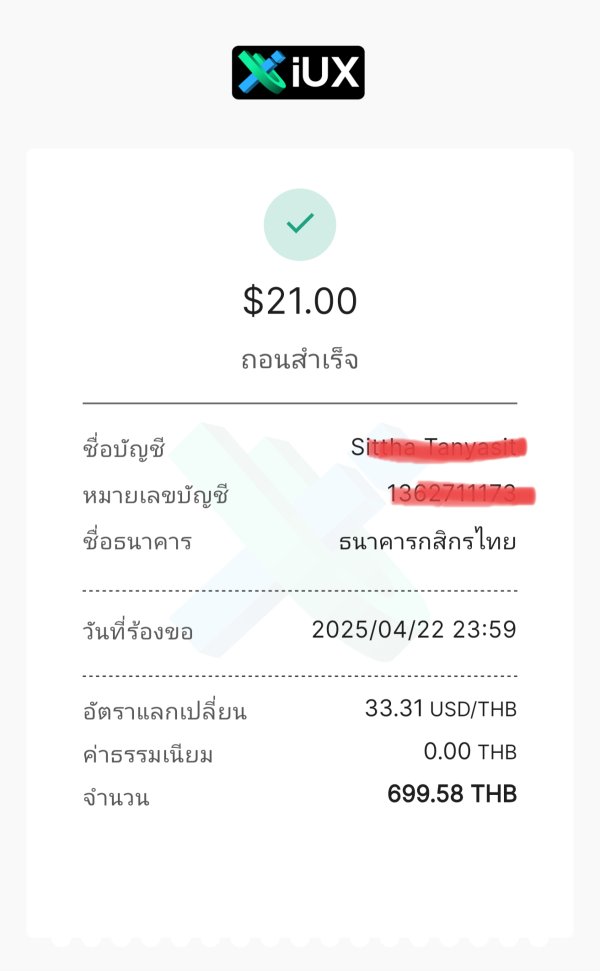 ผมถอนเงิน IUX แล้วยังไม่ได้เงิน ระบบบอกถอนเงินสำเร็จ แต่เงินไม่เข้าบัญชีแจ้งไป เค้าบอกให้รอ 24 ชั่วโมง ค่อยแจ้งใหม่ พอ 24 ชั่วโมงแจ้งไป บอกว่าส่งเรื่องไปสำนักงานใหญ่ให้ในรอตอบกลับ🌀