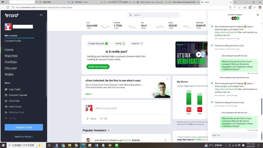 2025.07.25(星期五)台灣晚上10點30左右開始測試,測試時間大概一小時多,中間大概5~10分鐘更新一次詢問訊息,該公司一開始顯示助手已進入聊天"eToro Assistant has entered the chat",然後出現要我填寫服務工單的訊息"https://etoro.tw/3muOsFR ",我按下這個連結後開啟標題為"Customer Service Center"的網頁,這個網頁有我一開始選的線上客服與Get use solutions,因為線上客服已經沒有回應所以我選Get useful solutions然後往下拉選擇Open a Ticket後又跑回Customer Service Center網頁,就這樣循環。