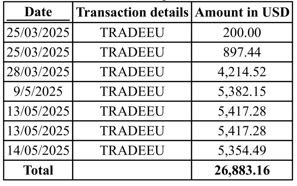 My experience with TRADEEU has been deeply disappointing. I decided to invest a small amount of money in March, and almost immediately, I began receiving frequent calls from different phone numbers. They first connected me with a woman named Okekssandra, who spoke at length about the company and her so-called “credentials. At first, the investment fluctuated - dropping for a few days, then showing some gains. She then suggested I make a larger deposit to maximize returns, citing market volatility. Over two months, my account balance repeatedly dropped to zero, only for them to add a so-called “rescue bonus” as a tactic to pressure me into funding more. In the end, my total losses exceeded $23,000. TRADEEU is a trap and a complete scam. They use persuasive language, false promises, and misleading “financial assessments” to lure people in.
