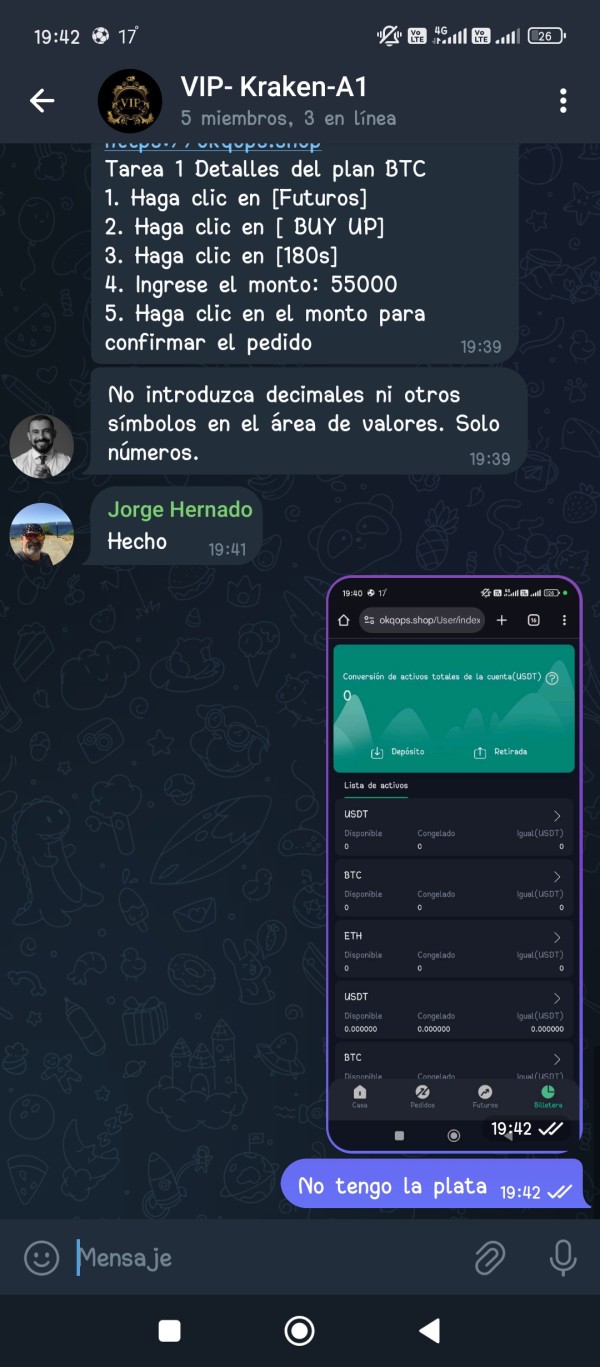 Lo primero q paso me contaron x telegram Luego me ofrecieron un trabajo El trabajo consiste en tareas .. cada tarea a terminar te depósitaban una comisión , luego las tarea pasaron de cero inversión a invertir un mínimo.. osea hacías una tarea de subscribirse a un Canal y en la otra tarea invertir para así poder cobrar la ganancia de la tarea más la inversión q hiciste y la ganancia. La cuestión q se turbava cada vez más interesante.. Luego ya pasabas a otro grupo donde era solo para invertir x q según ellos pasaste de ser principiante a vip. Luego en ese grupo había un mínimo de inversión a un máximo hos elejias la q querías.. Bueno al invertir en una tarea no es suficiente para el retiro sino si tenés q seguir invirtiendo para sacar la plata q ya ganaste.. y así sucesivamente hasta. Llega un momento q es mucho y te dan vueltas para retirar.. al principio te dan los mínimo después ya te enredan a invertir más y más ... Espero poder recuperar lo perdido