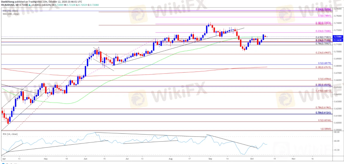 WikiFX Notizie (17 ottobre) - Recentemente si è diffusa la notizia che il principale partner commerciale dell'Australia ha vietato l'importazione di carbone dall'Australia, ma l'AUD/USD sembra indenne; Il ministro del Commercio, Simon Birmingham, ha dichiarato che “non ci sono prove per dimostrarlo”. Con il miglioramento della propensione al rischio, il momentum ribassista dell'AUD/USD si è indebolito. L'aumento del tasso di cambio dal minimo mensile di 0,7096 potrebbe guadagnare slancio.