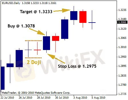 4. Se il prezzo di chiusura della terza candela è superiore al livello limite del doji, entra nel mercato e imposta lo stop loss 2-3 punti sotto il minimo del doji, o 2-3 punti sotto la terza candela;