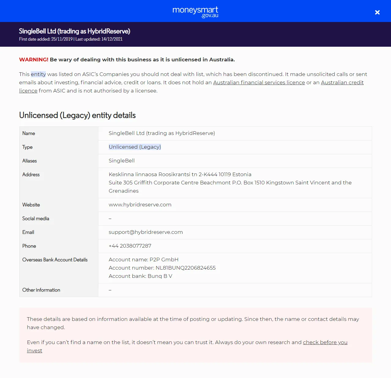 lista di avvisi per gli investitoriSingleBell Ltd (operante come HybridReserve).