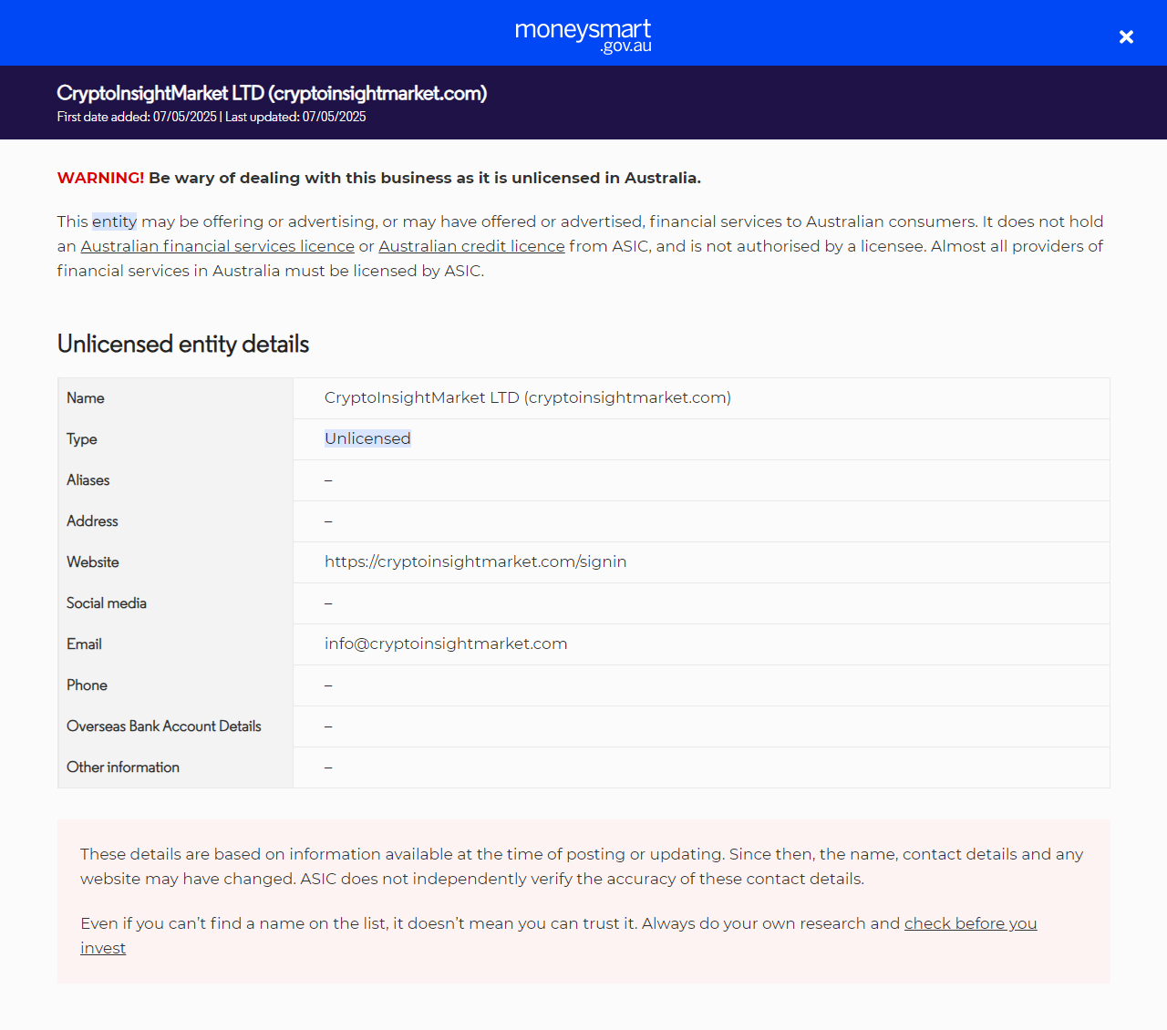 lista di avviso per gli investitoriCryptoInsightMarket LTD (cryptoinsightmarket.com).