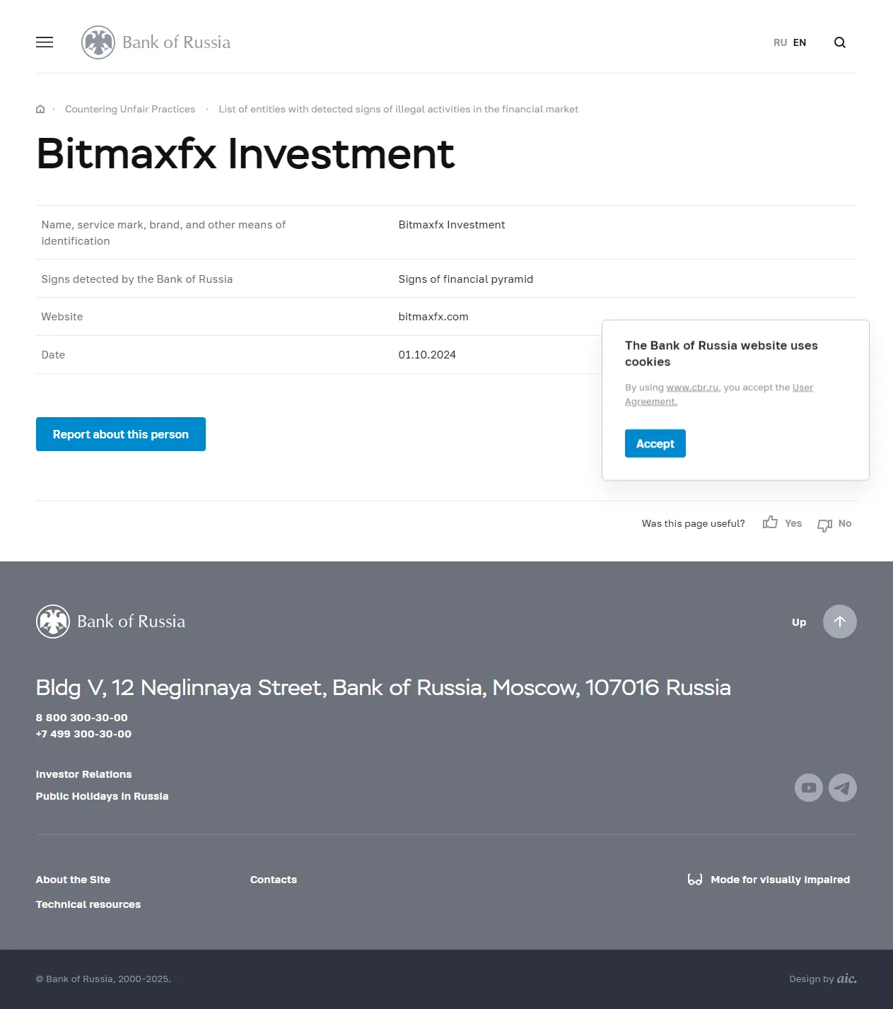 Elenco di entità con segni rilevati di attività illegali nel mercato finanziario Bitmaxfx Investment.