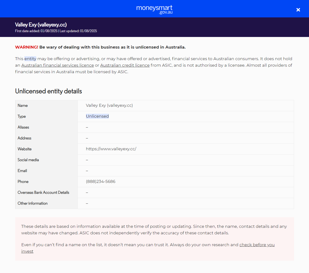 lista di avvisi per gli investitoriValley Exy (valleyexy.cc).