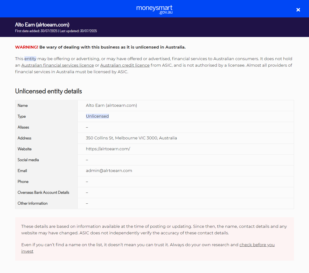 lista di avvisi per gli investitori Alto Earn (alrtoearn.com).
