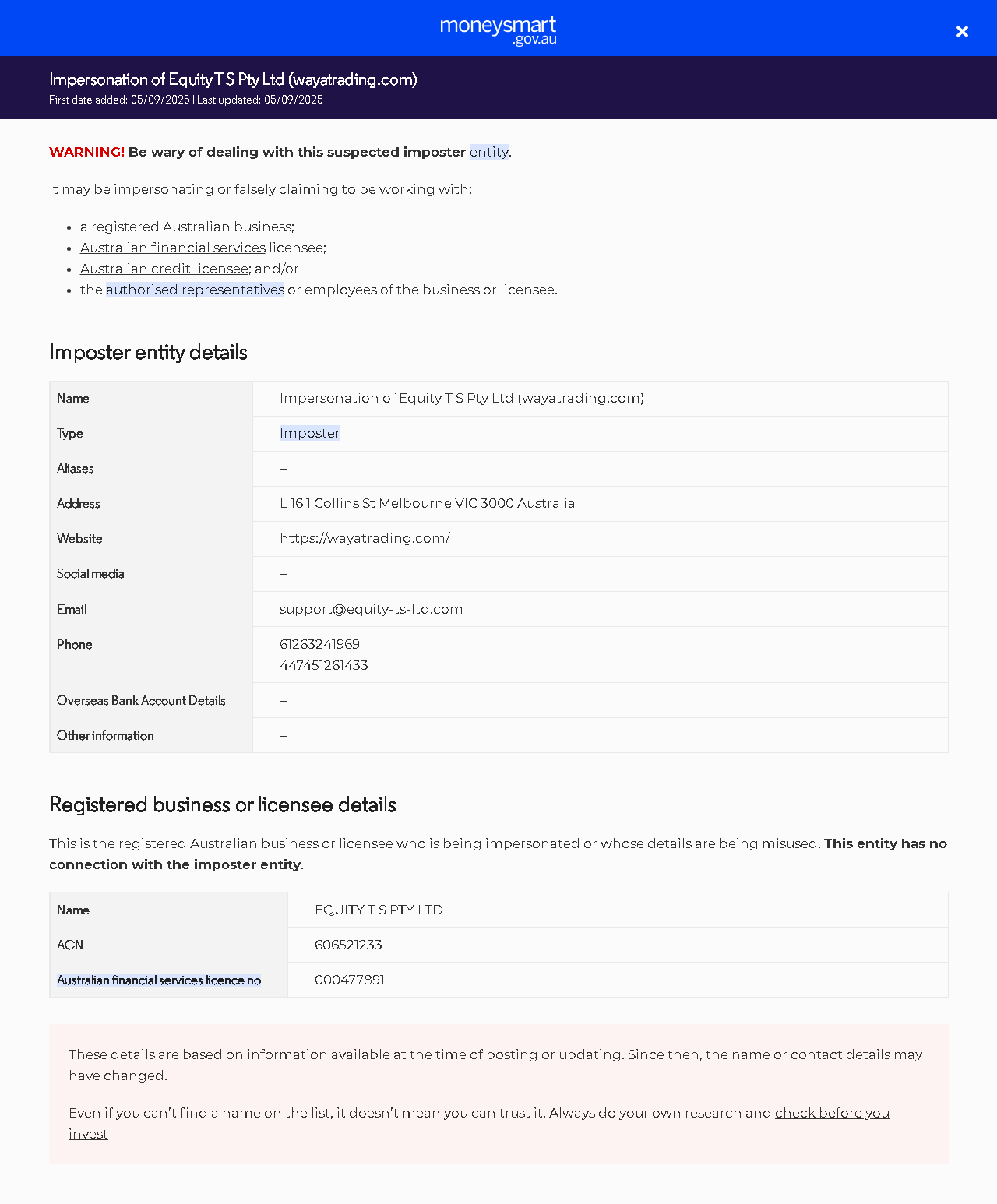 lista di avvisi per gli investitoriImpersonazione di Equity T S Pty Ltd (wayatrading.com).