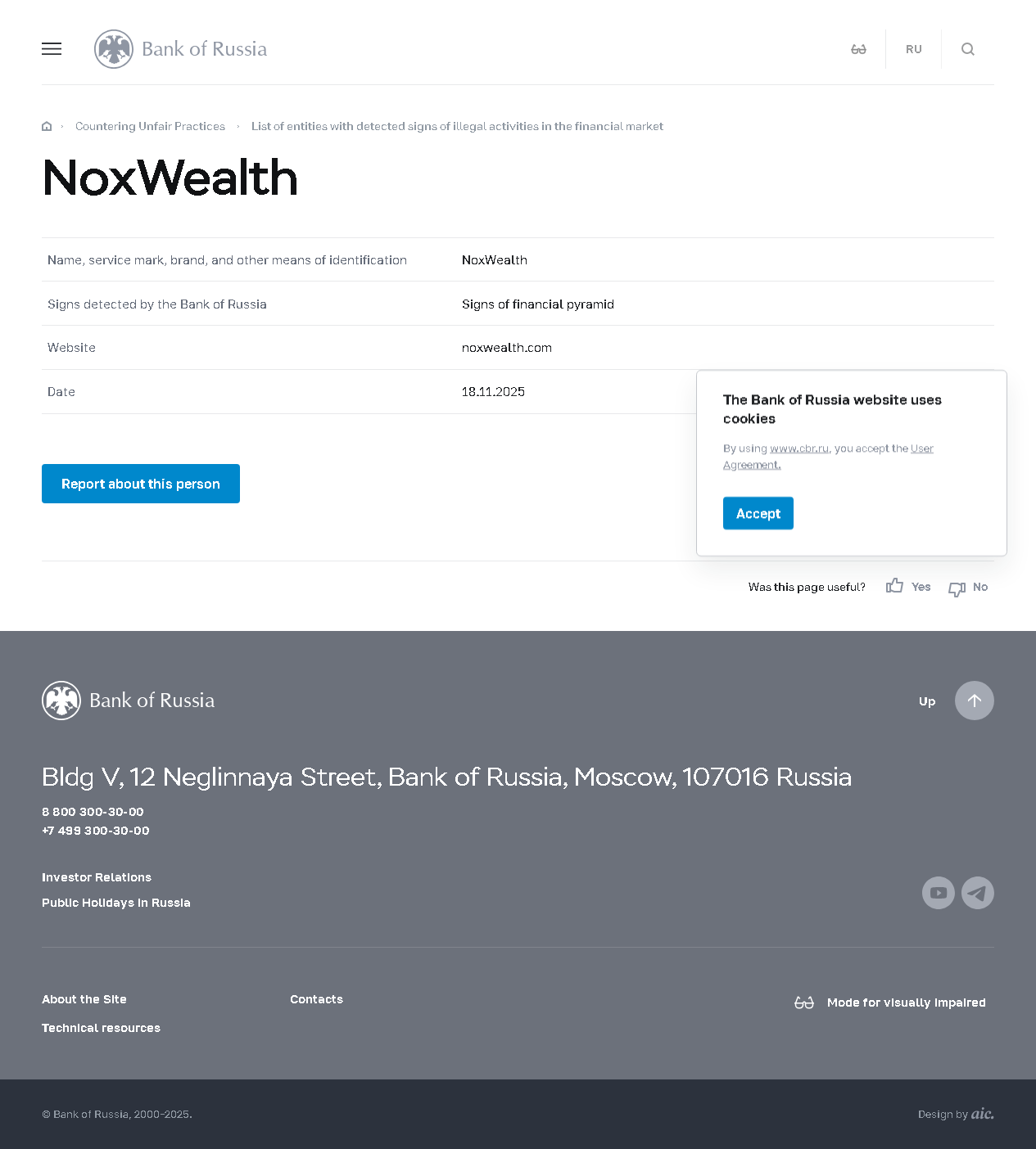 Nome, marchio di servizio, brand e altri mezzi di identificazione NoxWealth Segnali rilevati dalla Banca di Russia Segnali di piramide finanziaria Sito web noxwealth.com Data 18.11.2025.