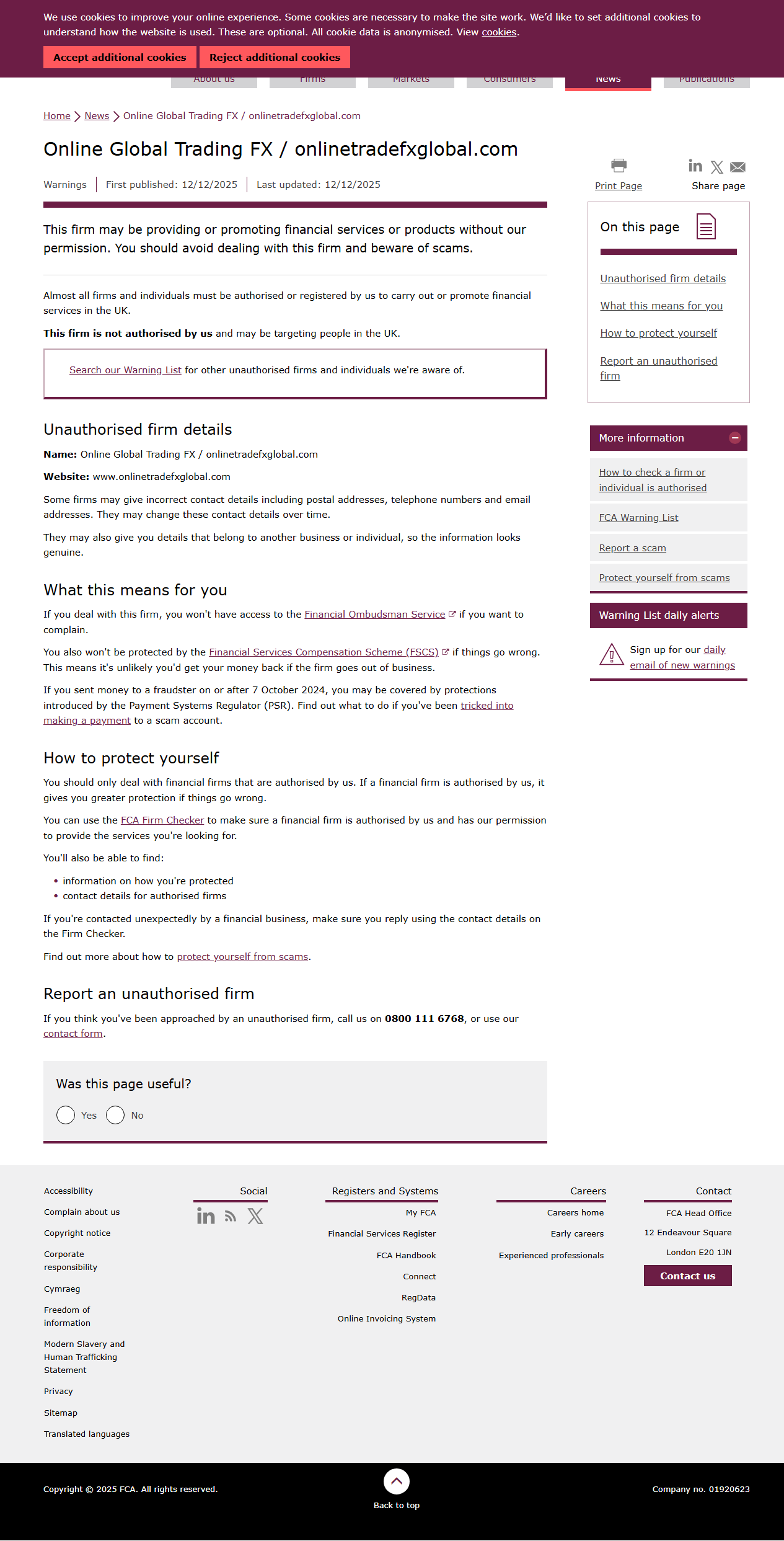 Elenco di avvertimento FCA delle società non autorizzate Online Global Trading FX / onlinetradefxglobal.com.