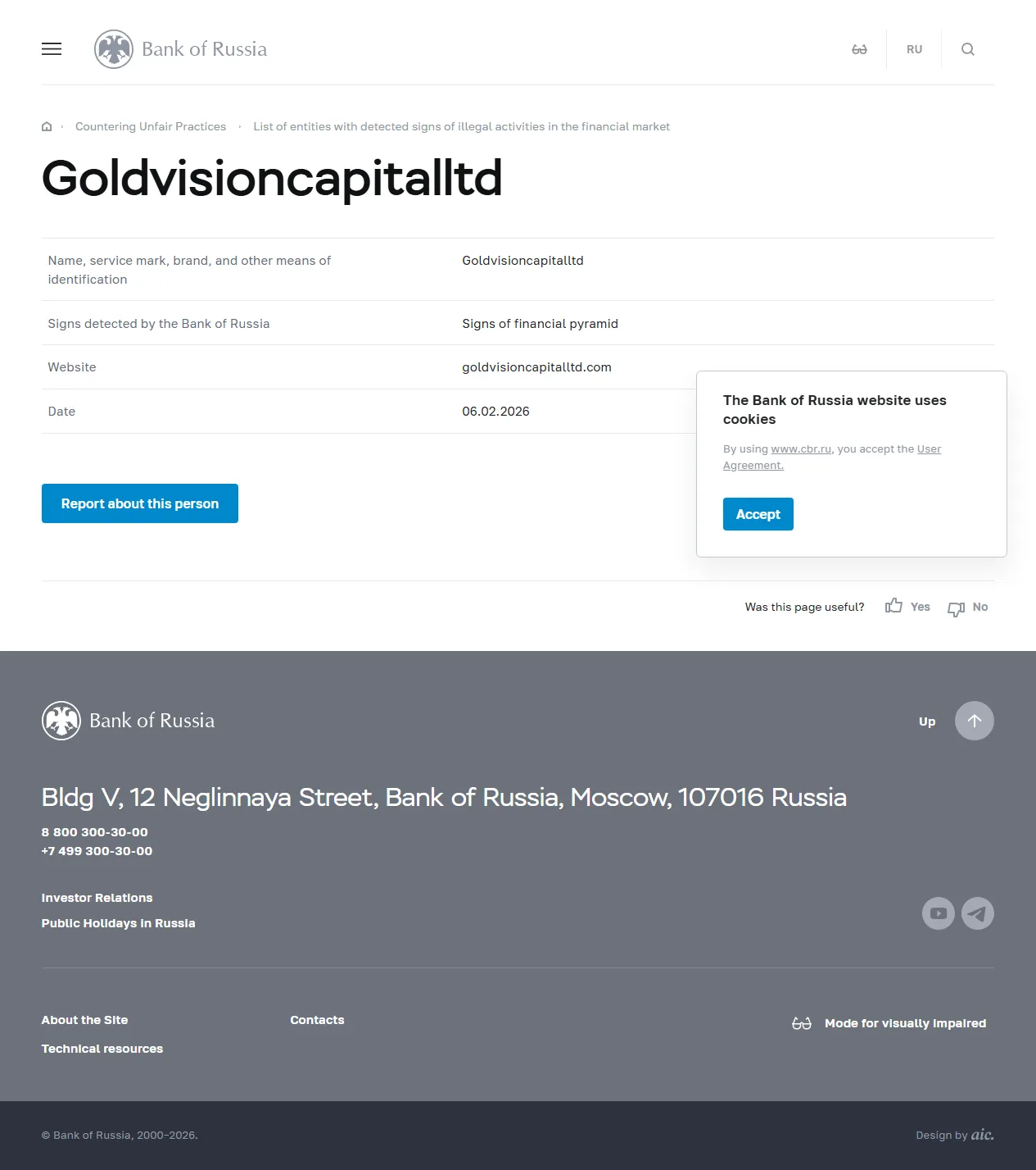 Elenco delle entità con segnali rilevati di attività illegali nel mercato finanziario Goldvisioncapitalltd.