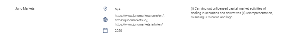 「このセクションには、無許可の Web サイト、投資商品、企業、個人のリストが含まれています。このリストには、SC からのライセンスを受けずに次の規制対象活動を実行している、または実行しているとしている人物が含まれます。資金管理、コーポレートファイナンスに関するアドバイス、投資アドバイス、財務計画、民間退職金制度の取り扱い 認可を受けずに承認された市場を運営する者 承認、許可、承認なしに有価証券を発行または提供する者 SC のロゴを悪用し、SC を虚偽表示する者」 Juno Markets該当なし https://www.junomarkets.com/en/、https://junomarkets.io/、https://www.junomarkets.info/en/ 2020 (i) 無許可の資本市場取引活動の実施有価証券およびデリバティブ (ii) 虚偽表示、SC の名前およびロゴの悪用
