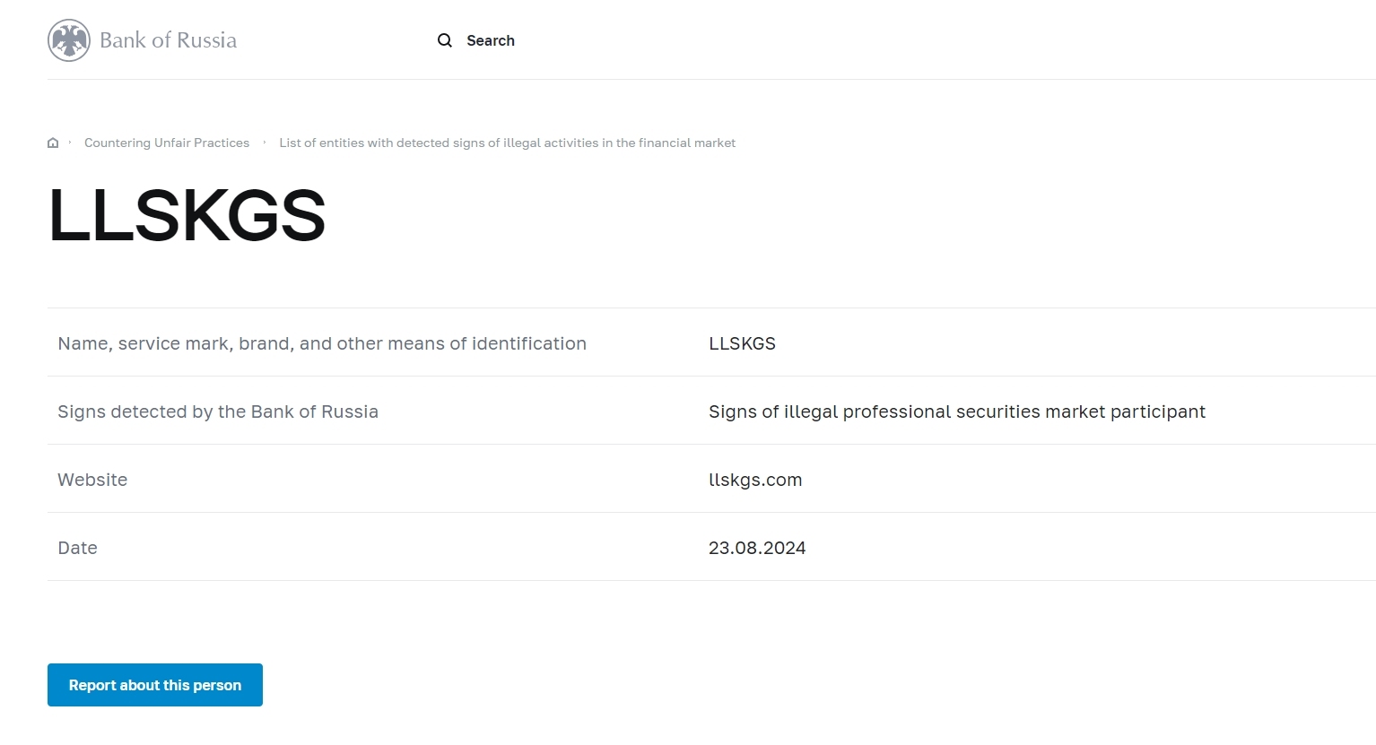 名前、サービスマーク、ブランド、その他の識別手段 Llskgsロシア銀行が違法な専門証券市場参加者のウェブサイトの兆候を検出 Llskgs.com 日付 2024年8月23日