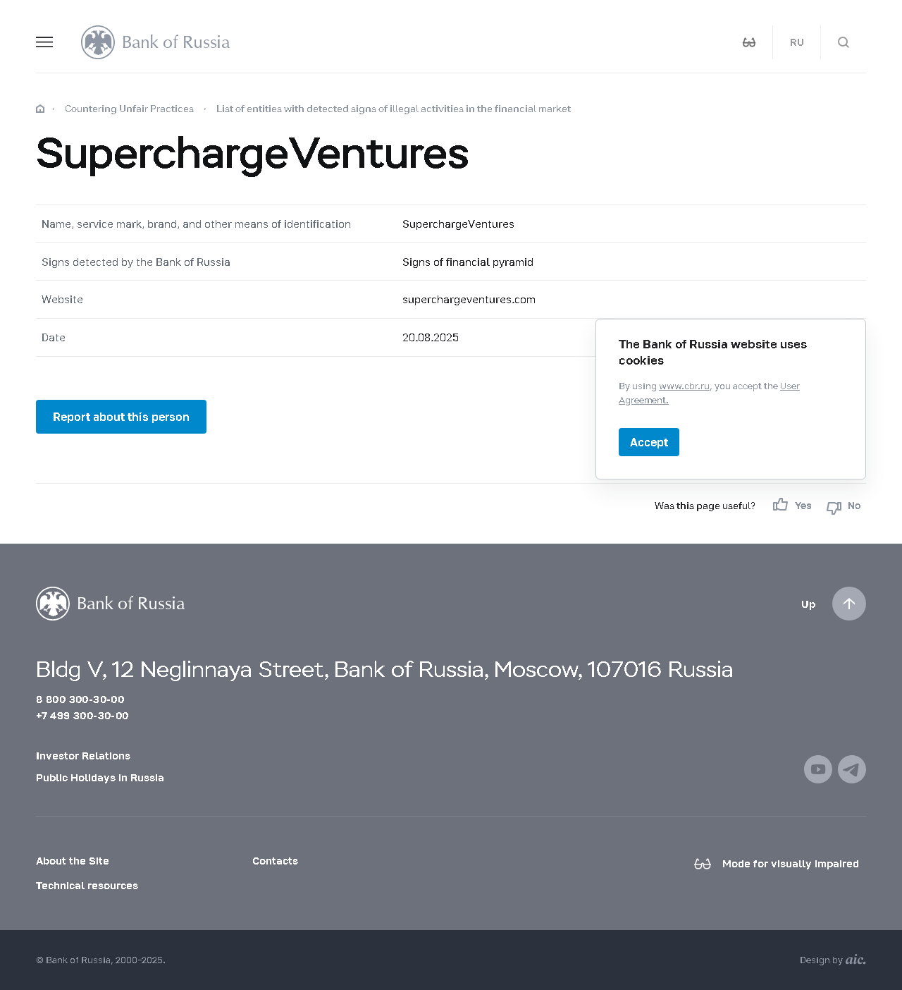 金融市場における違法行為の兆候が検出されたエンティティのリスト SuperchargeVentures.