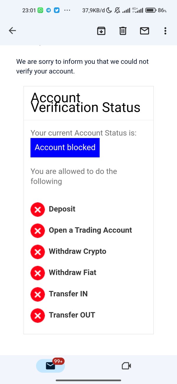 Sudah selama 1 minggu menunggu kyc, kyc diterima dan penarikan masih pending satu hari kemudian setelah akun sukses verif tiba2 akun langsung terblokir dan wd pun di reject