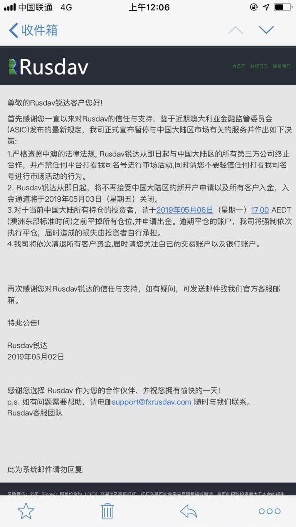 锐达平台突然间5/1号早上开始无法用手机操作MT4,多方打听已经被人举报,立案,5/2收到邮件突然要关闭服务器,导致套着的浮亏强制割掉,(本该能回来大部分)账户亏损50万人民币左右,剩余的净值提现了,现在还打着澳洲监管会的新规旗号,迟迟不给发放资金,之前提现一个工作日到账。(现在提现已经10天)这个平台连个公司电话都没有,网站上也找不到客服,发邮件,石沉大海,严重怀疑现在这个平台出问题,垃圾平台!