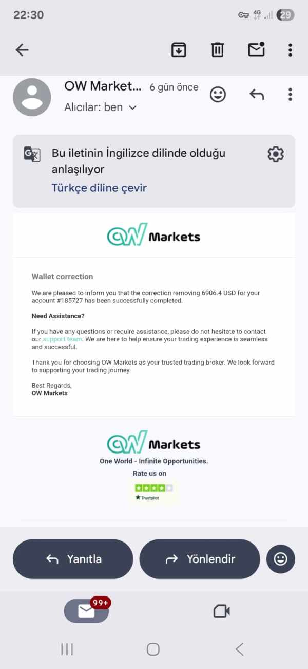 OW Markets (One World Markets LTD) is a deceptive organization; I strongly advise against investing. I deposited $4,000 into account number 2522224, executed trades, and made a profit. Although most of my trades were open, the institution deleted my profit from my MetaTrader 5 account. When I withdrew the funds, they did not pay me the $6,906 I earned. I demand a refund of the deleted amount. Otherwise, I will share the information publicly, along with the evidence.