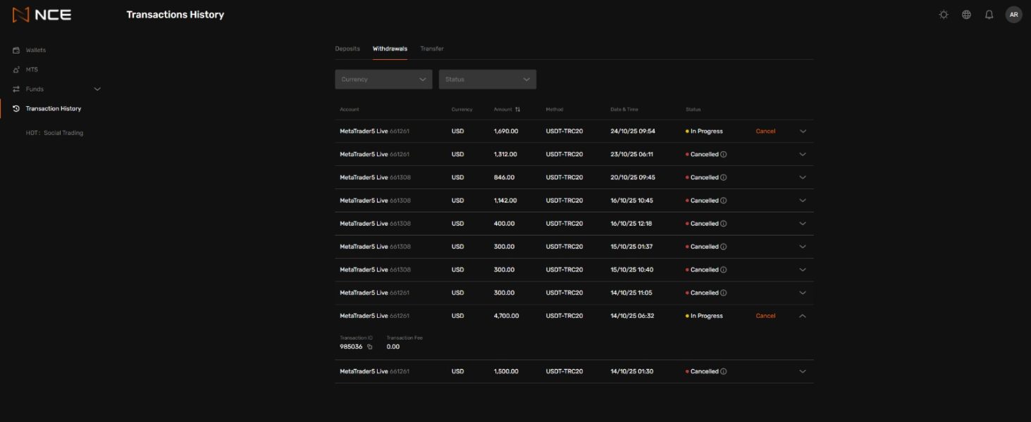 sudah 2 minggu mereka menahan keuntungan dan modal saya saya sudah mencoba email dan mereka tidak ada satupun yang memberikan jawaban MetaTrader5 Live 661261 USD 1,690.00 USDT-TRC20 24/10/25 09:54 In Progress Cancel Transaction Transaction Fee 0.00 MetaTrader5 Live 661261 USD 4,700.00 USDT-TRC20 14/10/25 06:32 In Progress Cancel Transaction Transaction Fee 0.00