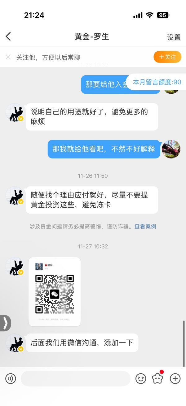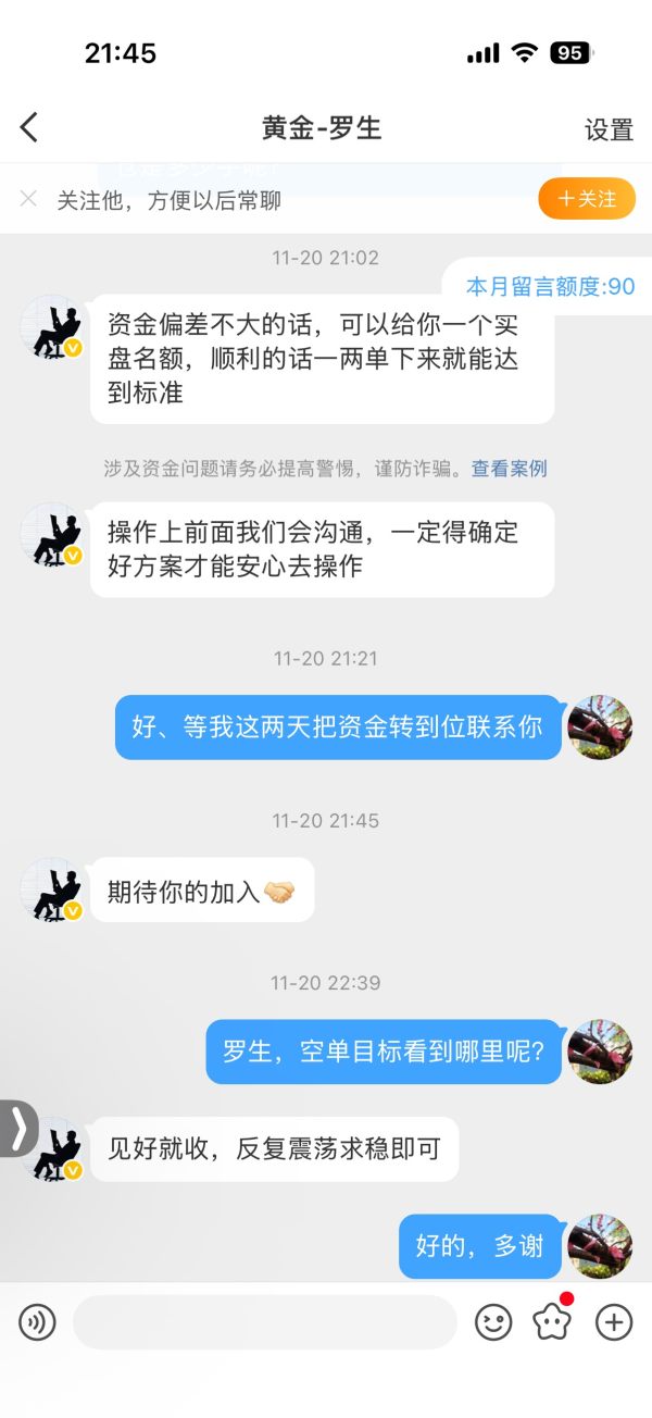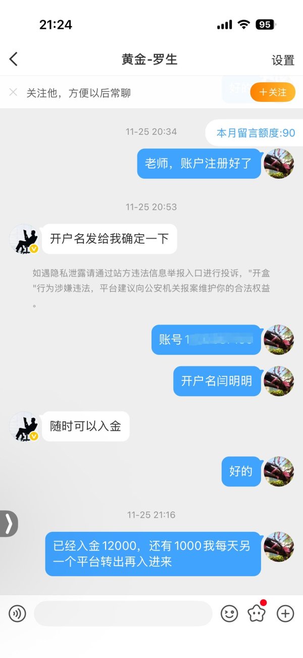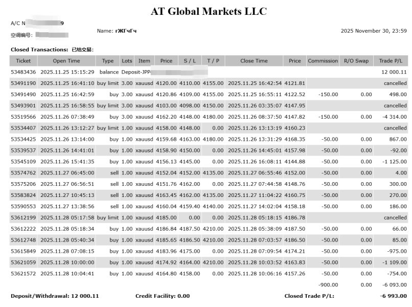 您好!2025年11月25日通过代理商罗生介绍开户并入金12000美元,之后几天在代理商的指导下进行交易,4天就导致账户亏损6993美元。 具体情况如下: 1. 代理商在微博宣传高胜率高收益,后来微博联系诱导在平台开户入金万元以上就可以指导带单,并称1-2单就可以翻仓标准 2.多次在微信喊单交易XAUUSD,包括开仓点位,平仓点位,开仓手数 3.我按照其指令操作,包括开仓手数,开仓及平仓点位,罗生还要求开重仓,产生高额手续费,按照他的指导操盘导致账户巨额亏损。 5.我认为代理商存在误导性宣传和不当指导,违反平台对代理商的管理规定(代理商不应提供投资建议或保证盈利)。根据贵平台用户协议和监管要求,请官方介入调查代理商行为,并协助我补偿亏损或退还部分资金。 感谢官方快速处理!