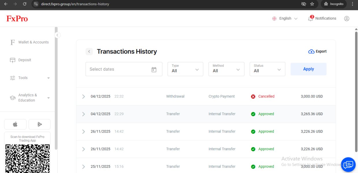 Hello all people around the world this is my case with FXPro my account number is 5301179** i deposit to my fxpro amount 3000usd 25 november 2025 i made profit 265$ i try wd on 4 december 2025 until now they not processing my withdrawal all i need is please this broker be professional pay your client fast its only small profit Update 15 december 2025 i tried to cancel my withdrawal, the reason is if they dont want to pay my profit then i withdraw my deposit i try wd my deposit 3000$ , untill 16 dec still nothing i trade again using my profit and my profit now 351.34$ try wd again and still nothing i dont know what happened to this broker they have good regulation at all please proceed my withdrawal thanks