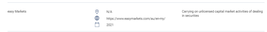 "이 섹션에는 승인되지 않은 웹사이트, 투자 상품, 회사 및 개인의 목록이 포함되어 있습니다. 이 목록에는 다음이 포함됩니다. 펀드 관리, 기업 금융에 대한 조언, 투자 자문, 재무 계획 및 개인 은퇴 계획 거래 승인 없이 인정된 시장을 운영하는 사람 승인, 승인 또는 인정 없이 증권을 발행 또는 제공하는 사람 sc의 로고를 오용하고 sc를 허위로 표시하는 사람 " 쉬운 시장 n/a https://www. easyMarkets .com/au/en-my/ 2021 증권 거래의 무면허 자본 시장 활동 수행