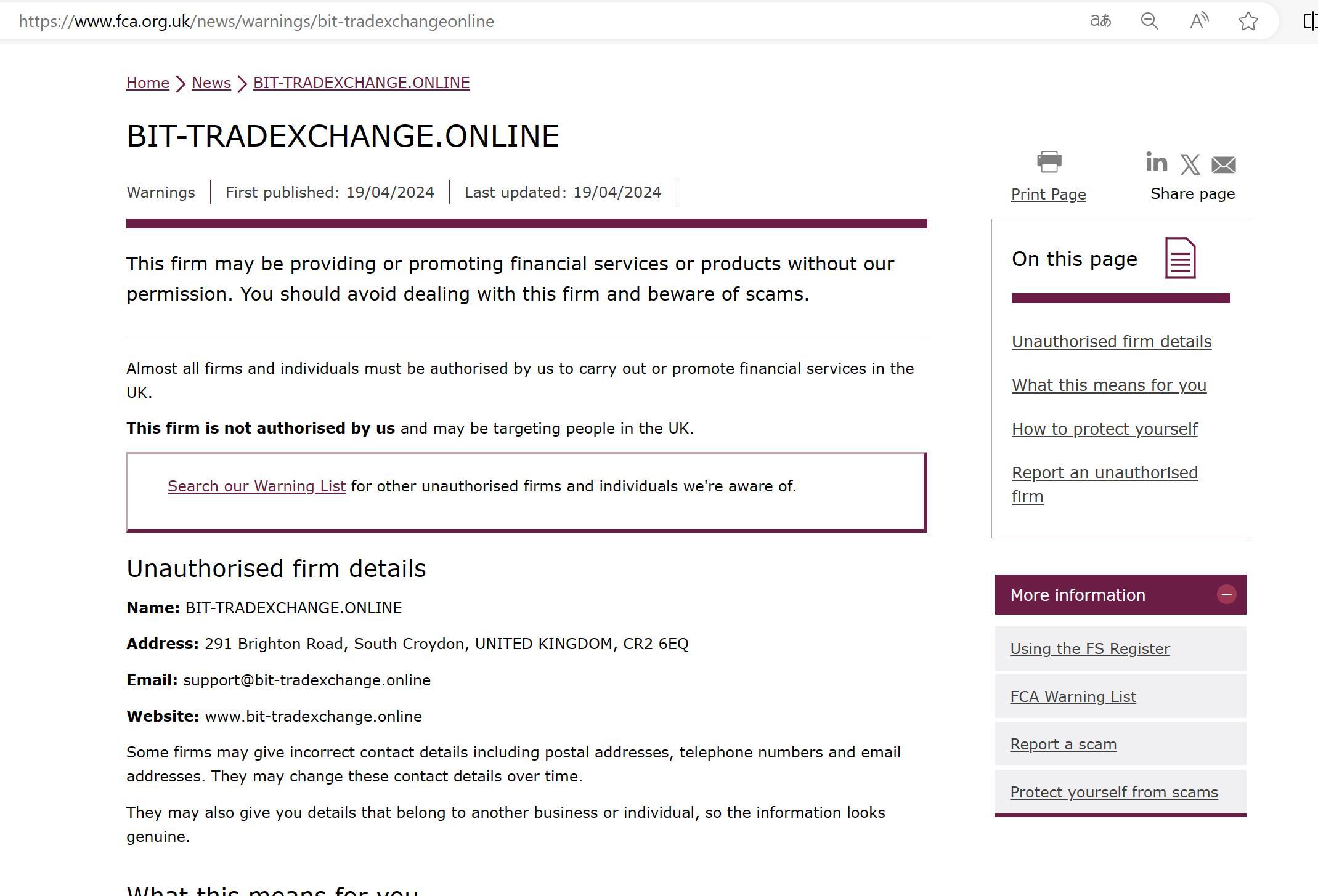 최초 게시일: 2024년 4월 19일 최종 업데이트일: 2024년 4월 19일 이 회사는 당사의 허가 없이 금융 서비스나 상품을 제공하거나 홍보할 수 있습니다. 이 회사와의 거래를 피하고 사기를 조심해야 합니다. 거의 모든 회사와 개인은 영국에서 금융 서비스를 수행하거나 홍보하기 위해 당사의 승인을 받아야 합니다. 이 회사는 우리의 승인을 받지 않았으며 영국에 있는 사람들을 대상으로 할 수 있습니다. 우리가 알고 있는 다른 승인되지 않은 회사 및 개인에 대한 경고 목록을 검색하십시오. 승인되지 않은 회사 세부정보 이름: BIT-TRADEXCHANGE .온라인 주소: 291 Brighton Road, South Croydon, United Kingdom, cr2 6eq 이메일: support@ BIT-TRADEXCHANGE .온라인 웹사이트: www. BIT-TRADEXCHANGE .online 일부 회사에서는 우편 주소, 전화번호, 이메일 주소 등 잘못된 연락처 정보를 제공할 수 있습니다. 시간이 지남에 따라 이러한 연락처 정보가 변경될 수 있습니다. 또한 다른 기업이나 개인에 속한 세부 정보를 제공할 수도 있으므로 정보가 진짜처럼 보입니다.
