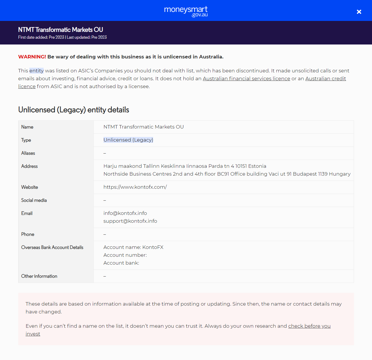 투자자 경고 목록NTMT Transformatic Markets OU.