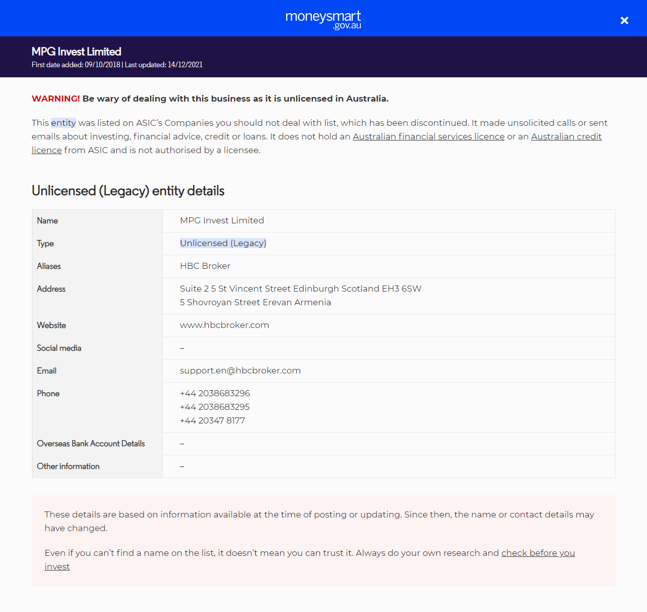 투자자 경고 목록MPG Invest Limited.