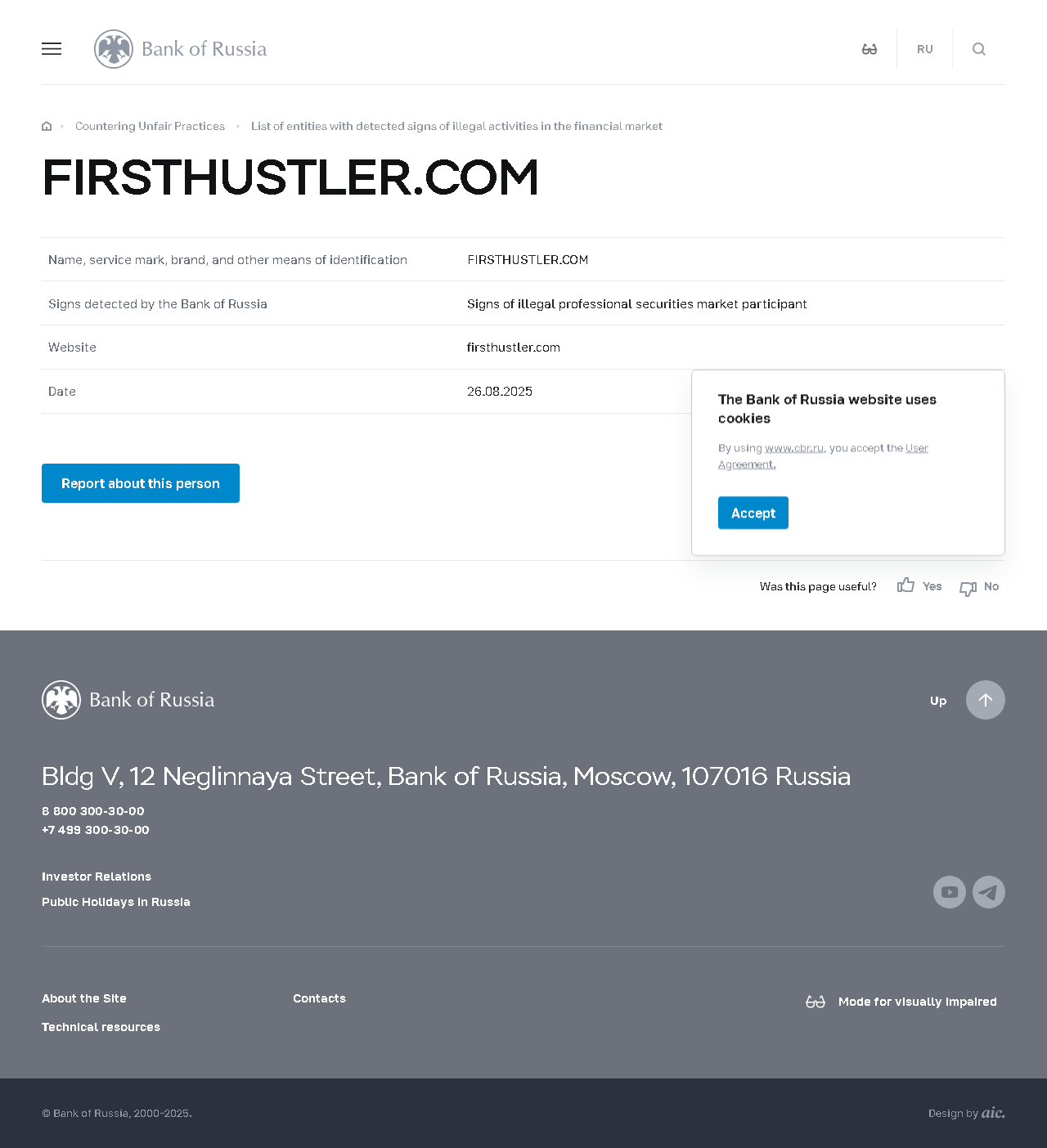 금융 시장에서 불법 활동의 징후가 감지된 개체 목록 FIRSTHUSTLER.COM.