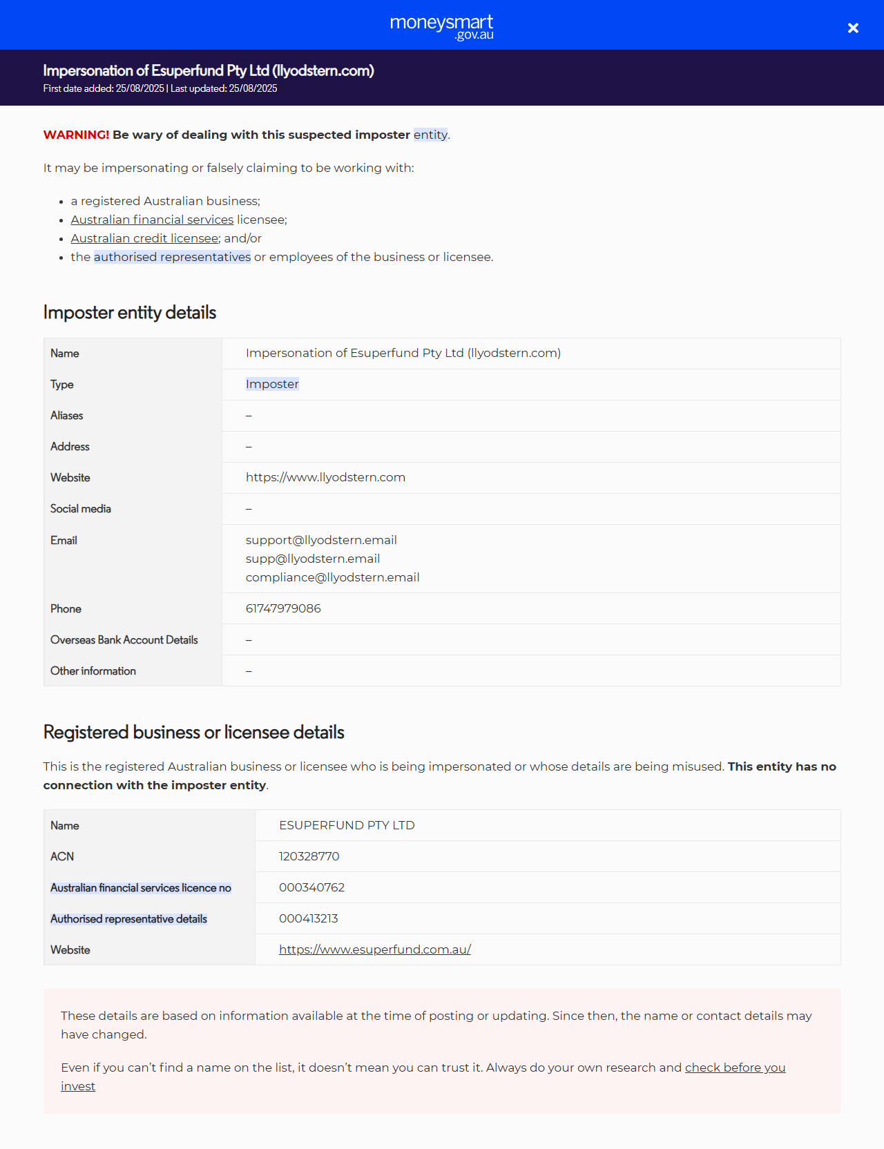 투자자 경고 목록Esuperfund Pty Ltd (llyodstern.com) 사칭.
