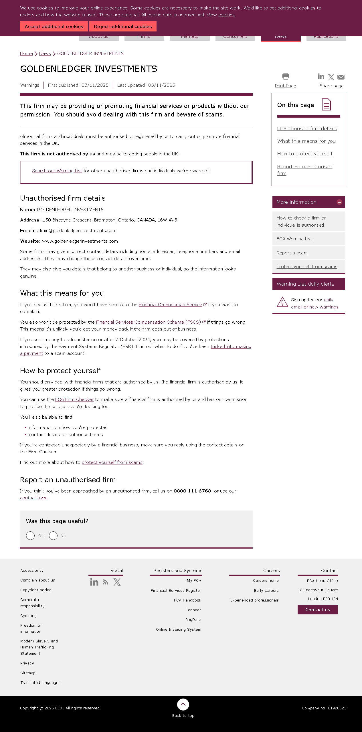 이 회사는 우리의 허가 없이 금융 서비스나 상품을 제공하거나 홍보할 수 있습니다. 이 회사와 거래하지 말고 사기에 주의해야 합니다. 영국에서 금융 서비스를 수행하거나 홍보하기 위해서는 거의 모든 회사와 개인이 우리의 승인을 받거나 등록되어야 합니다. 이 회사는 우리의 승인을 받지 않았으며 영국 내 사람들을 대상으로 할 수 있습니다. 우리가 알고 있는 다른 무단 회사와 개인에 대한 경고 목록을 검색하세요. 무단 회사 세부 정보 이름: GOLDENLEDGER INVESTMENTS 주소: 150 Biscayne Crescent, Brampton, Ontario, CANADA, L6W 4V3 이메일: admin@goldenledgerinvestments.com 웹사이트: www.goldenledgerinvestments.com 일부 회사는 우편 주소, 전화번호, 이메일 주소를 포함한 잘못된 연락처 정보를 제공할 수 있습니다. 시간이 지남에 따라 이 연락처 정보를 변경할 수도 있습니다. 또한 다른 사람에게 속한 세부 정보를 제공할 수 있습니다. 비즈니스 또는 개인, 그래서 정보가 진짜처럼 보입니다.".